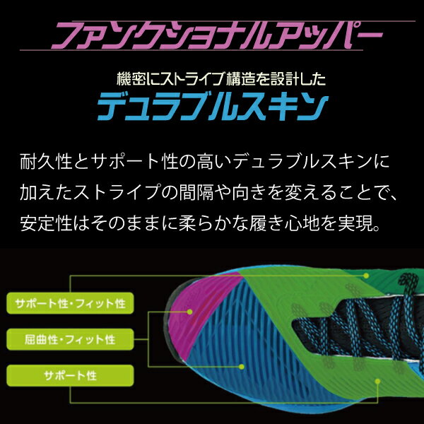 ●耐久性とサポート性を兼ね備えた素材「デュラブルスキン」のストライプ間隔と向きを調整した新構造により、学生層から社会人が求める柔らかな履き心地に仕上がっております。