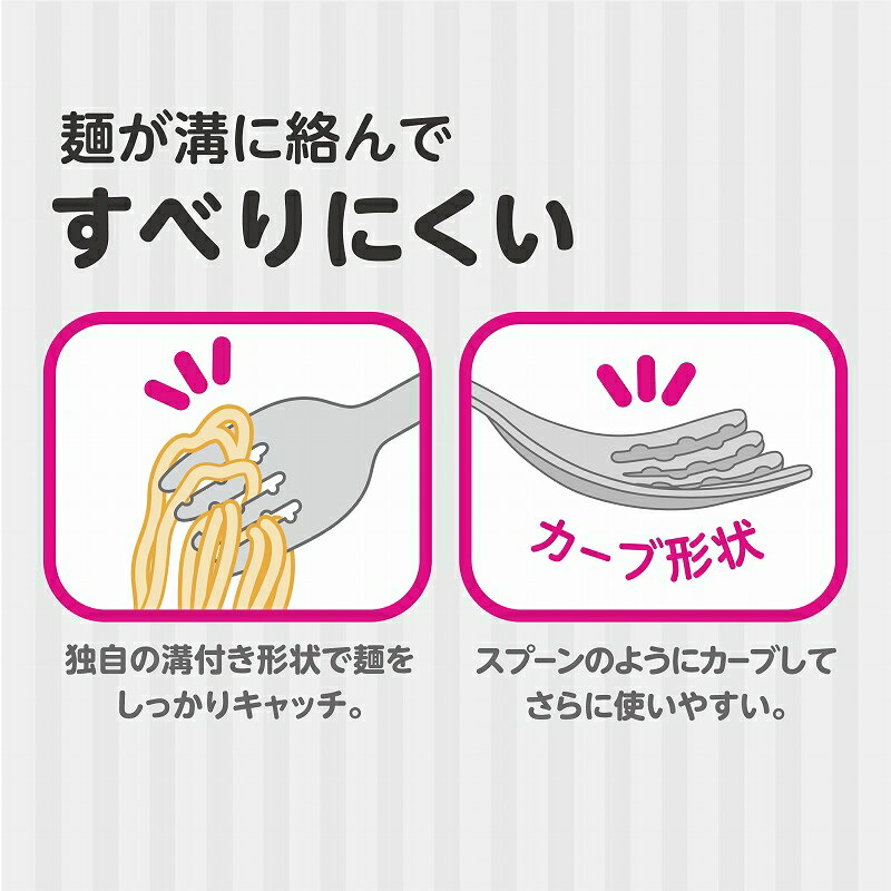 ● 使いやすさや機能はそのまま● 対象年齢:1.5歳〜● フォーク:溝がついて麺がすべり落ちない食べにくい麺類もしっかりキャッチし、こぼさずじょうずに食べられます。