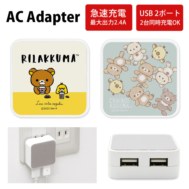 リラックマ ACアダプタ 2台同時充電可能 USB 2ポート搭載 アダプター 2.4A スマホ コンセント タブレット ゲーム機 充電器 キャラクター グッズ アダプタ かわいい オシャレ 可愛い コリラックマ キイロイトリ ゆるかわ 詳しく見る